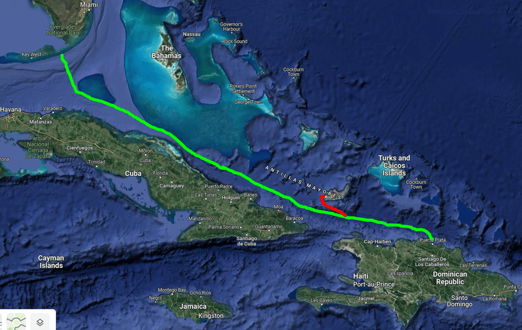 On the map below, you can see our intended route in lime green, with the detour to Great Inagua in red.