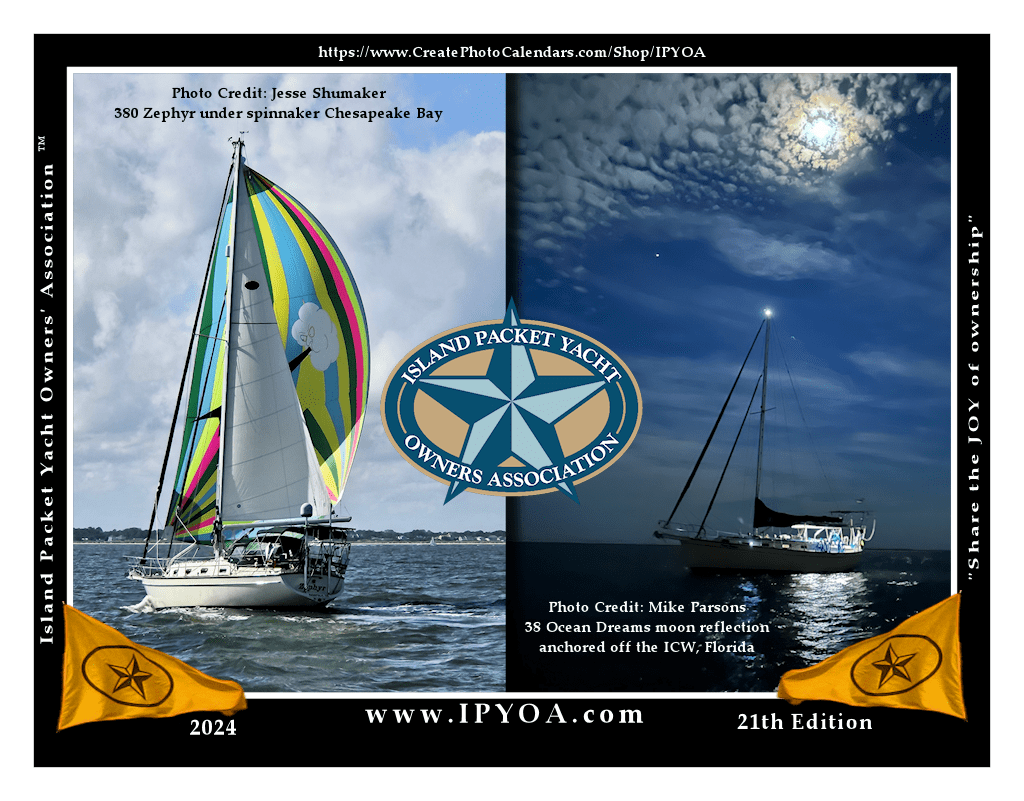 We were excited to see that a photo of Zephyr flying the spinnaker made it to the cover of the 2024 IPYOA calendar. Also, I photo that I had taken when we chartered in the San Juan Islands also made it to another page on the calendar. There are some greats photos of IPs at other exotic location in the calendar and you can see the rest at this link.
