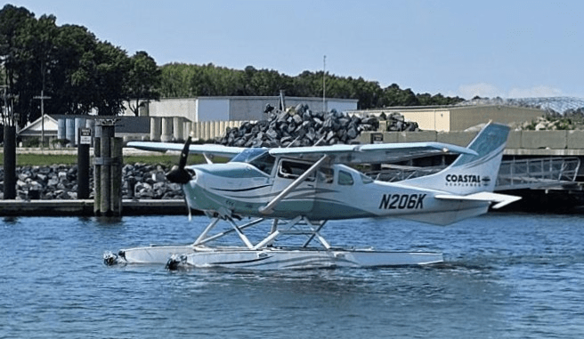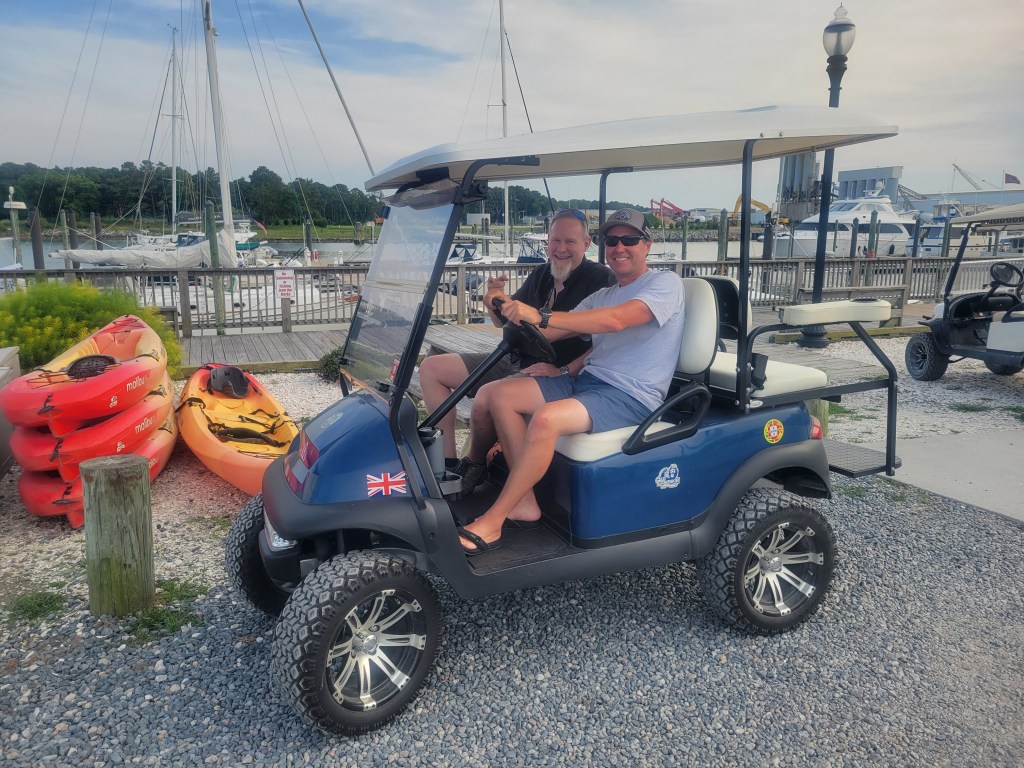 Then I made it back to Virginia to teach a 3 day ASA104 sailing class, and on the following weekend an ASA103 class. On the 104 class you go on a short cruise, so we went from Willoughby Bay (where the sailing school is located) to our home marina of Morningstar at Little Creek for a night, over to Cape Charles for a night and then back to Willoughby Bay. I had a great group for the 104 class including Griff (who was in one of my ASA101 classes this spring) and Richard. Richards mechanical background came in handy when we ended up helping out with a fuel leak on another boat. Griff gave us a golf cart tour of Cape Charles since his parents live there and let us borrow their cart. An interesting sight at Cape Charles was a seaplane that had landed and was motoring into the marina.